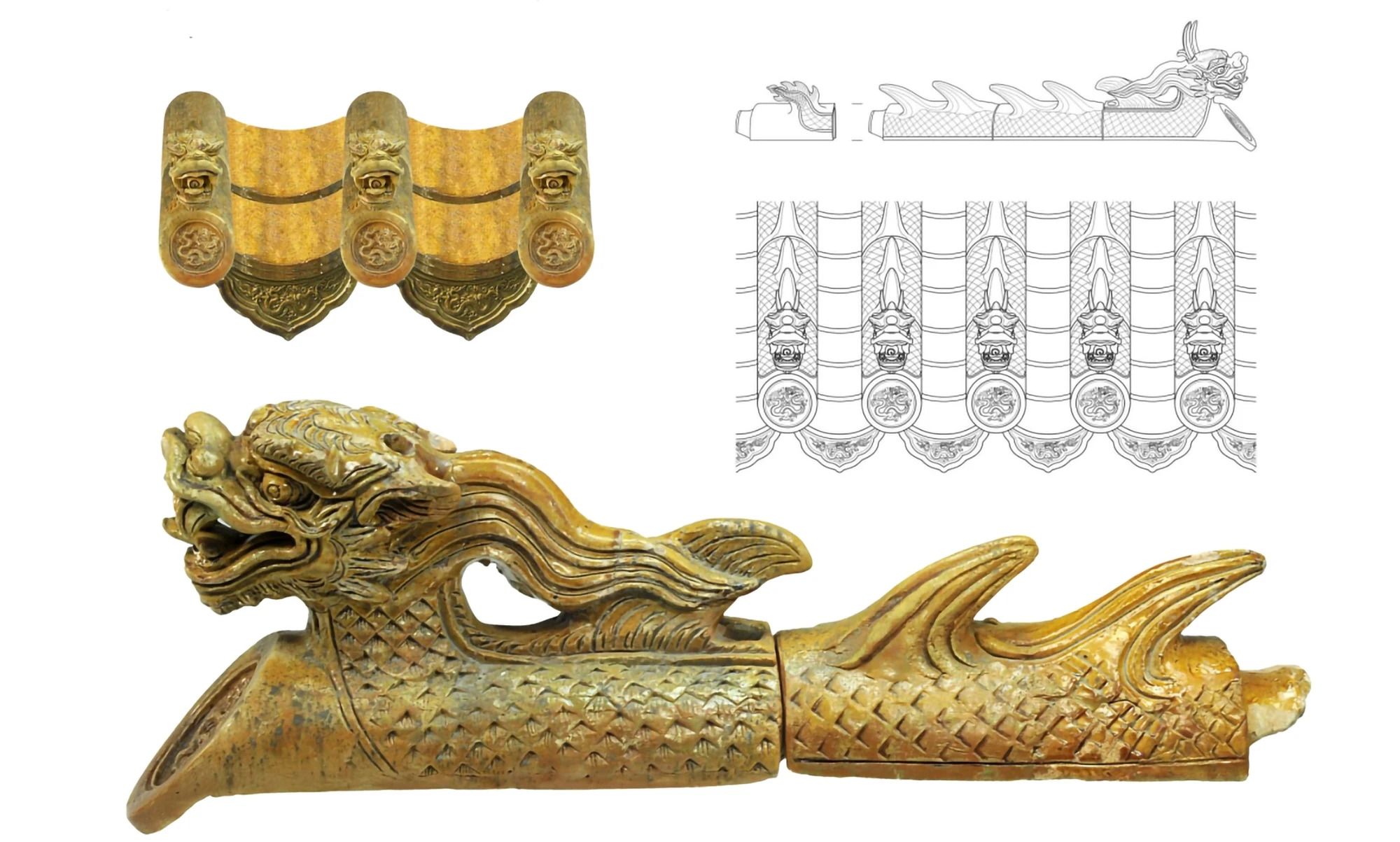 A dragon-shaped roof tile with a yellow glaze is typical of the palace architecture at the Thang Long Imperial Citadel.