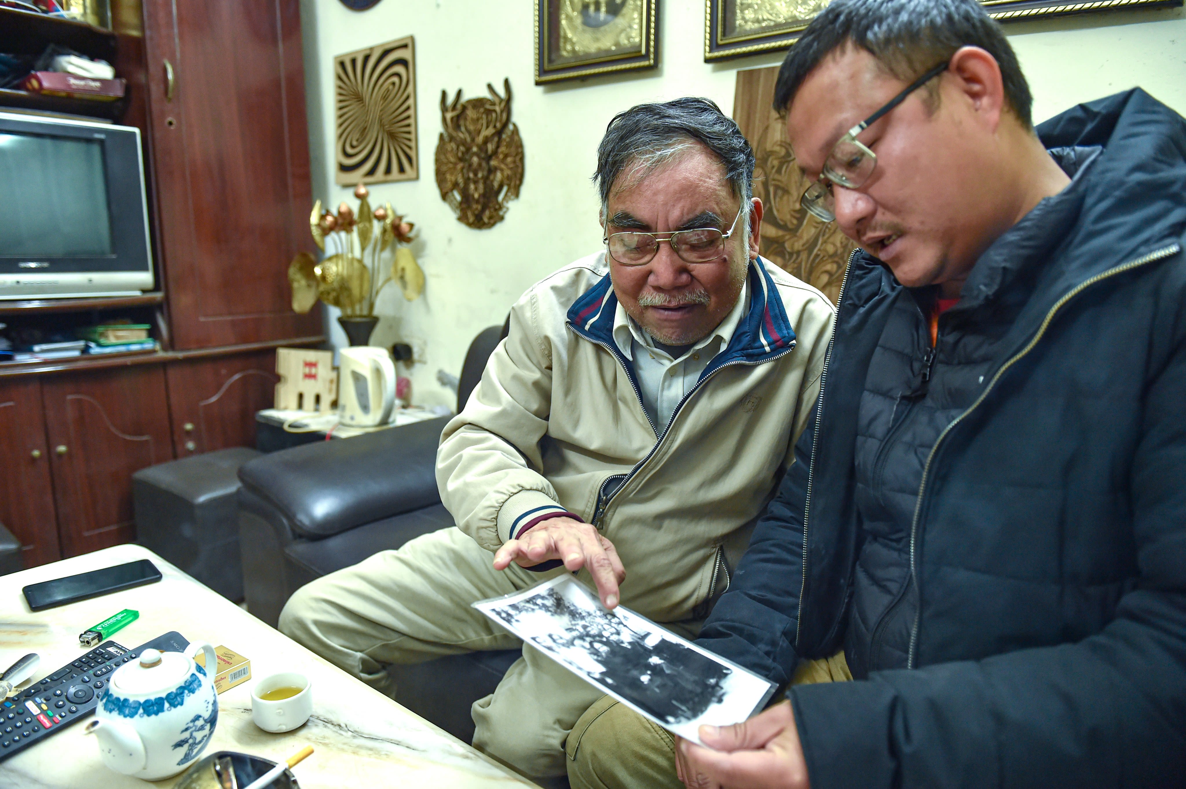 Giat shows a photo of his family members who were killed by B-52 bombings. (Photo: Thanh Dat)