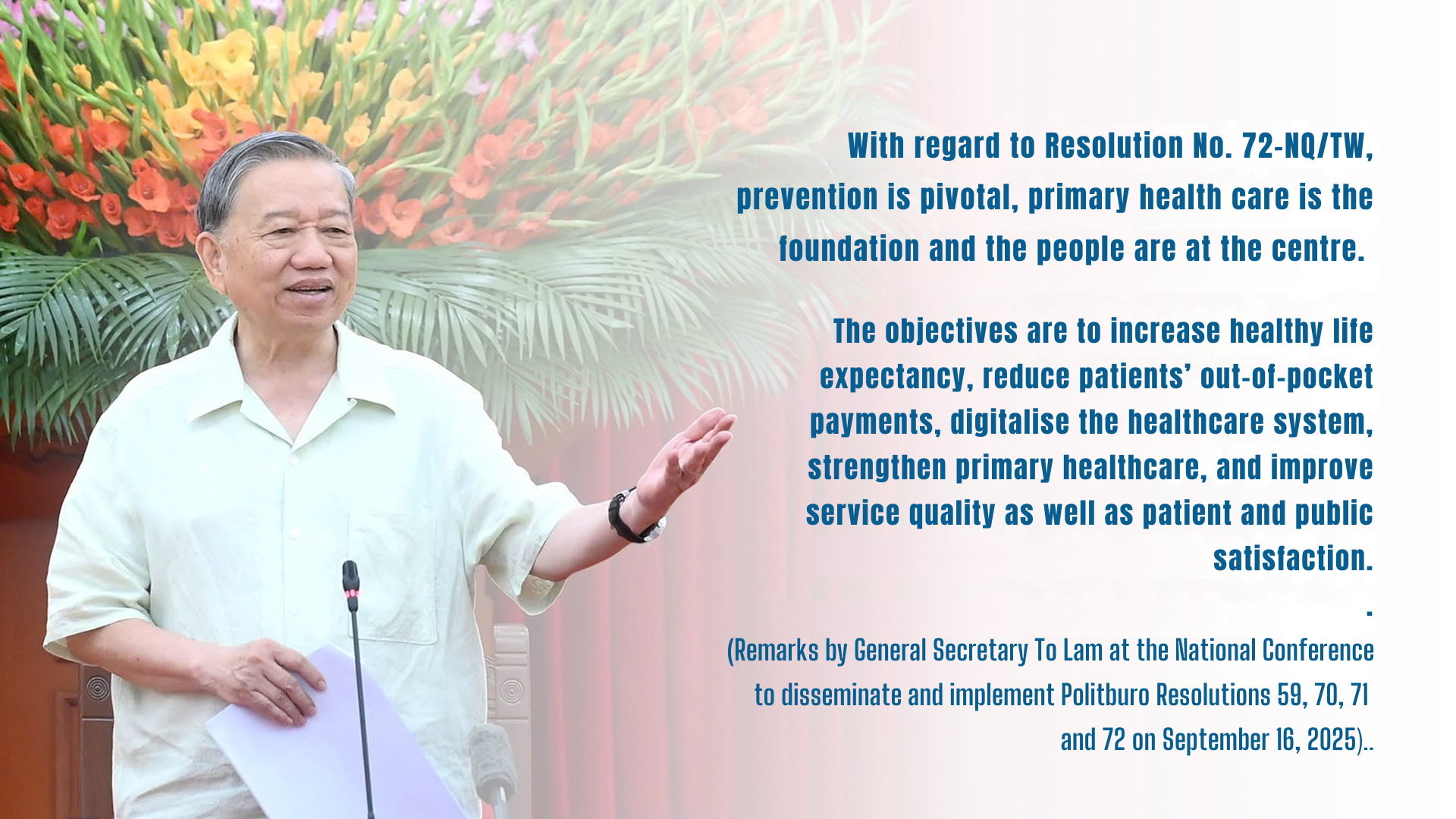 The issuance of Resolution No. 72-NQ/TW marks a profound shift in awareness and action in the work of protecting, caring for and improving the people’s health. At the same time, it introduces comprehensive innovation with breakthrough solutions aimed at building a healthy Viet Nam, where all people receive healthcare, live longer, healthier and more wholesome lives, improve their physical wellbeing, raise awareness of health protection, and proactively prevent disease across society, thereby helping to promote a strong, civilised and prosperous country in the new era.