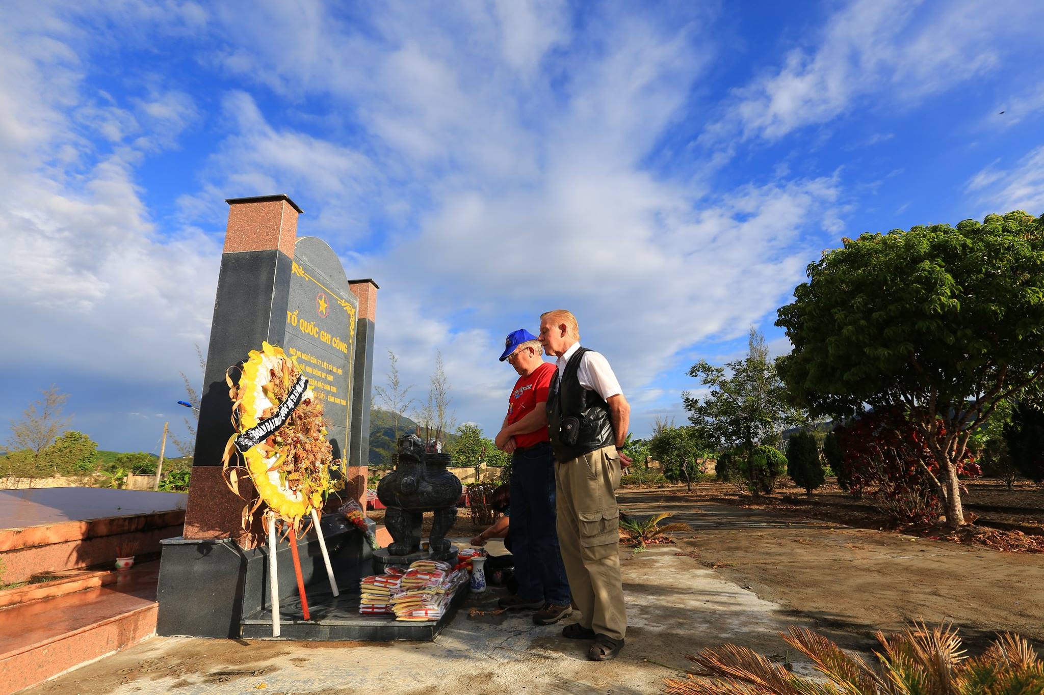 US veteran Bob Connor and Colonel Martin offer incense at the Dong Nai provincial martyrs’ cemetery.