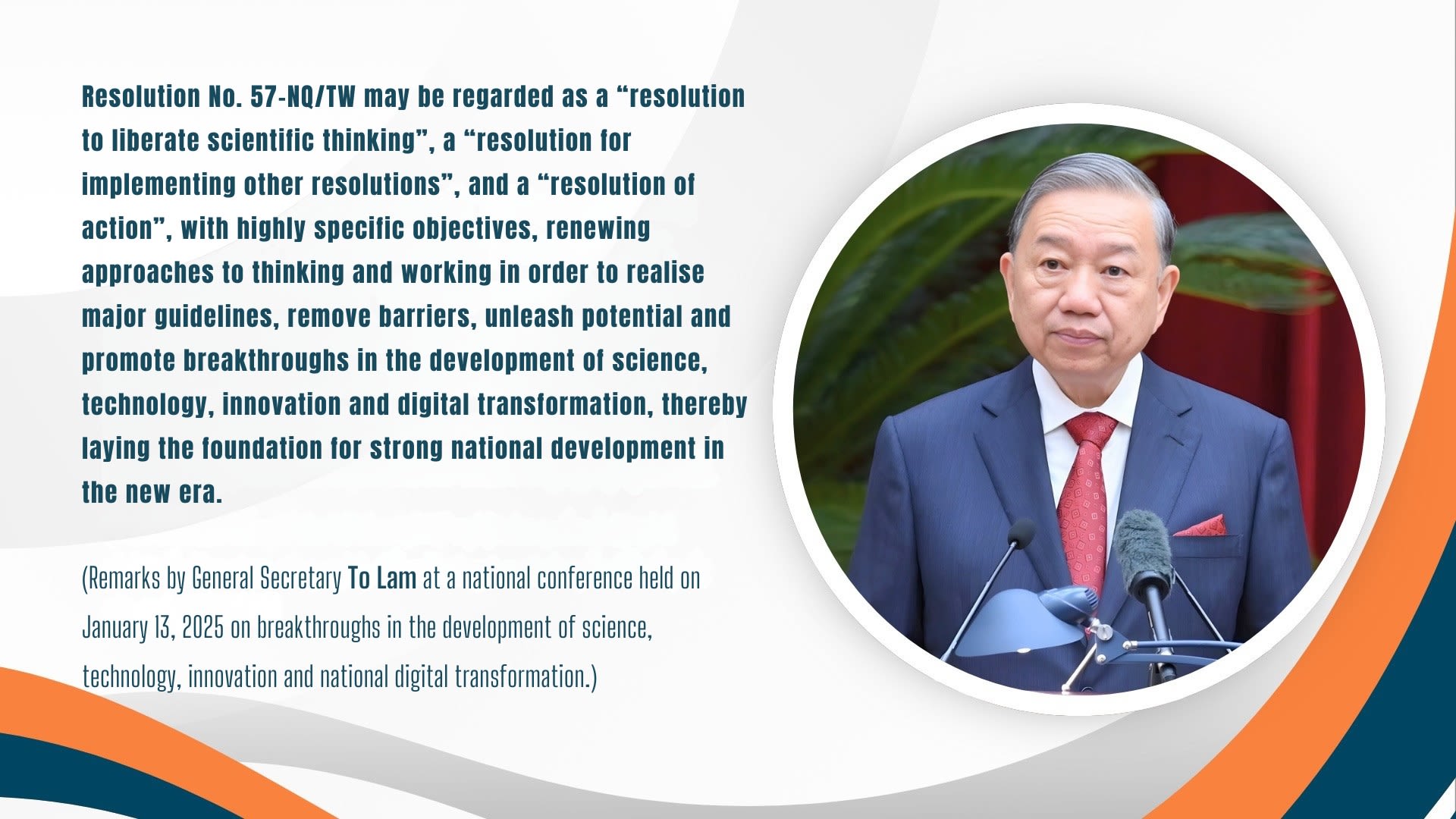 The resolution identifies breakthroughs in the development of science, technology, innovation and national digital transformation as a profound and comprehensive revolution across all fields, to be implemented decisively, persistently, synchronously, consistently and over the long term, through breakthrough and revolutionary solutions. It calls for strengthening the Party’s comprehensive leadership, promoting the combined strength of the entire political system, and encouraging the active participation of entrepreneurs, businesses and the people.