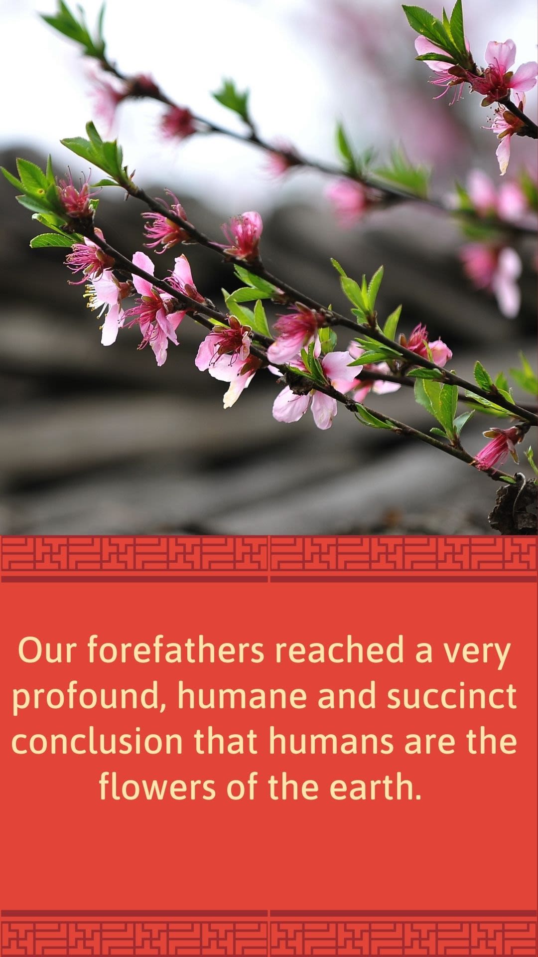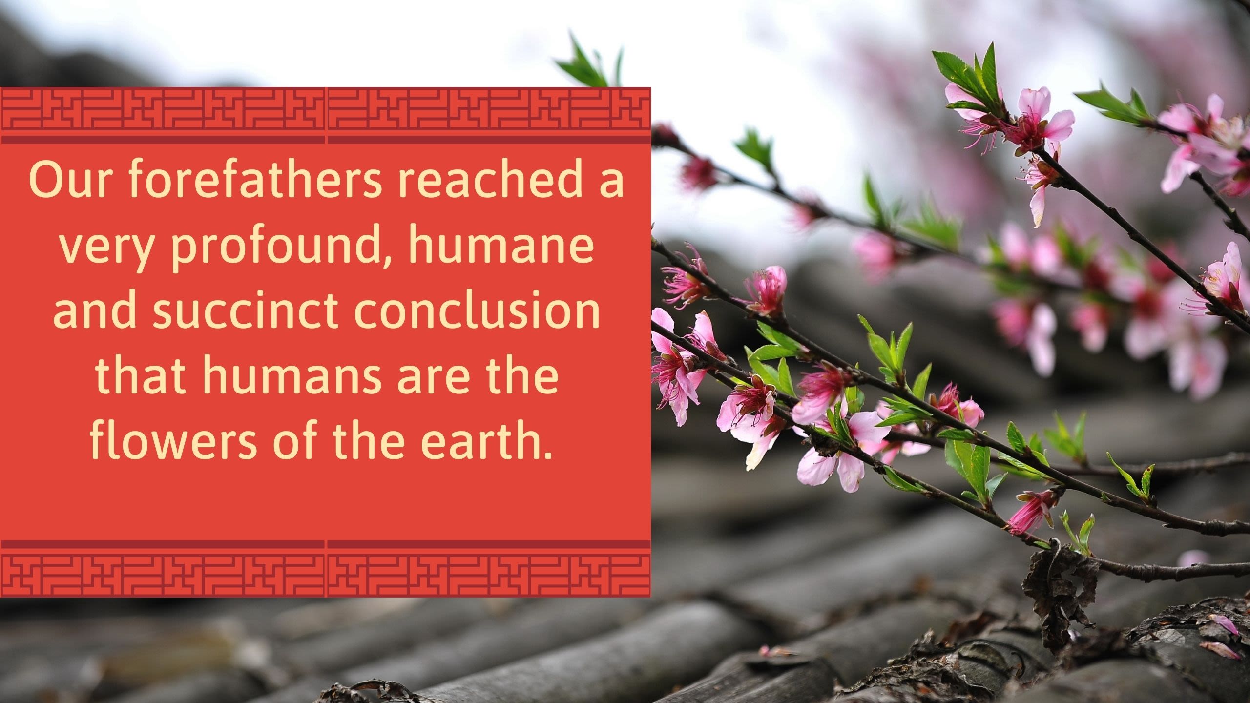 Humans are associated with the land where they are born and humans should live in harmony with nature like the myriad of flowers rising from the earth, humans being the most beautiful of all flowers. History researchers are split by two arguments that seem opposing but in fact are complementary: humans made history and history made humans.