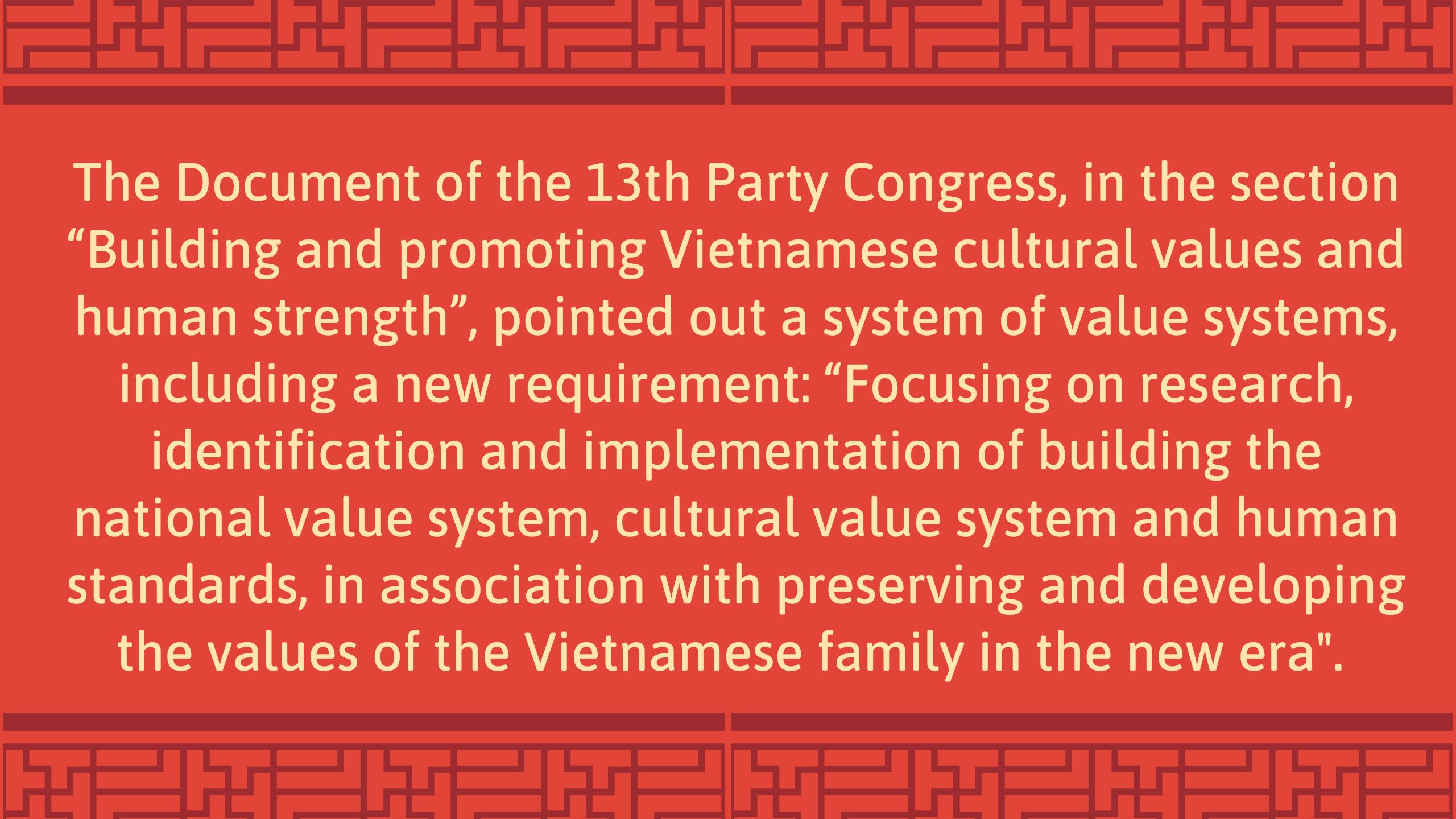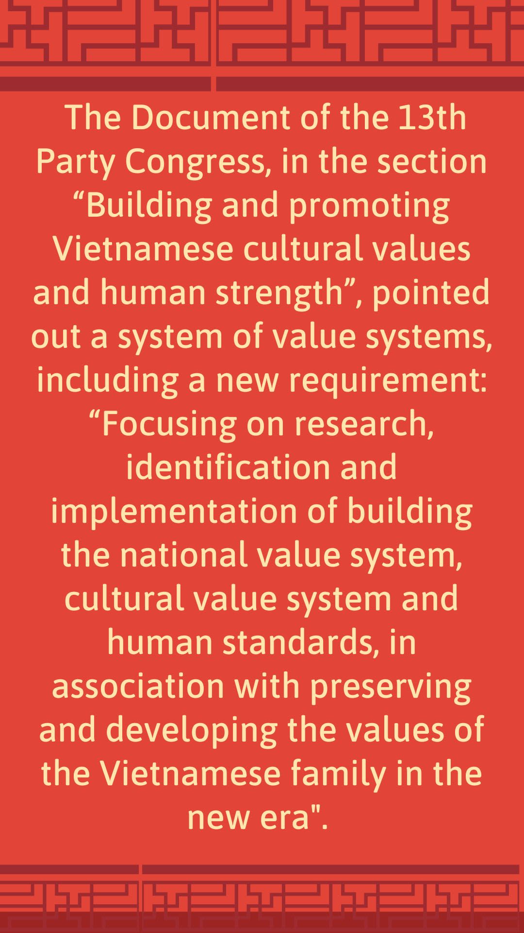 Because of the above relationship, in the process of determining the System of Vietnamese Human Norms, it is necessary to simultaneously study different value systems to form a coherent, harmonious system; a value scale affecting life, creating a large voluntary movement of the masses. Accordingly, the Document requires the implementation of all three stages:
