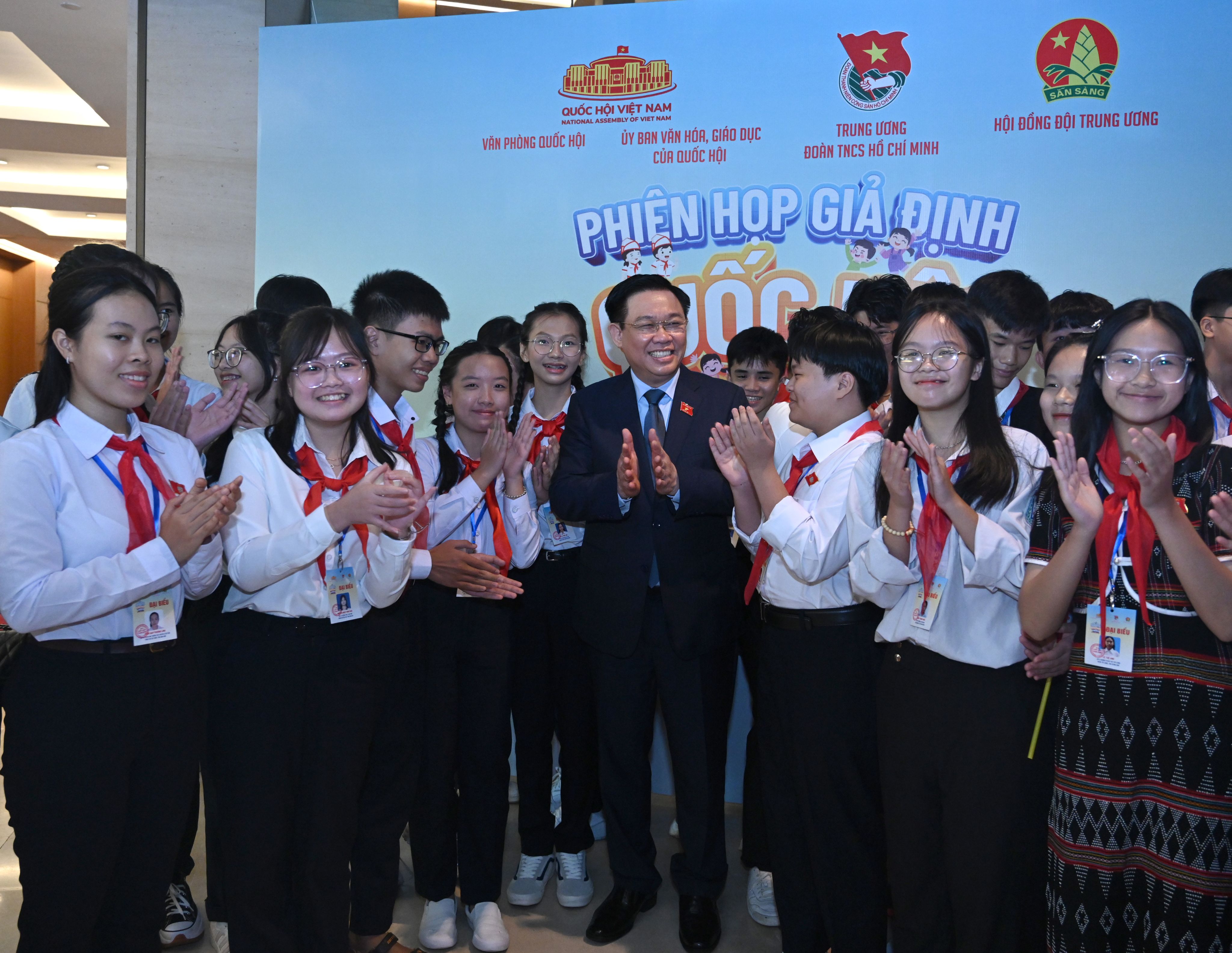NA Chairman Vuong Dinh Hue and children at the first “Children’s National Assembly” hypothetical session. (Photo: Duy Linh)