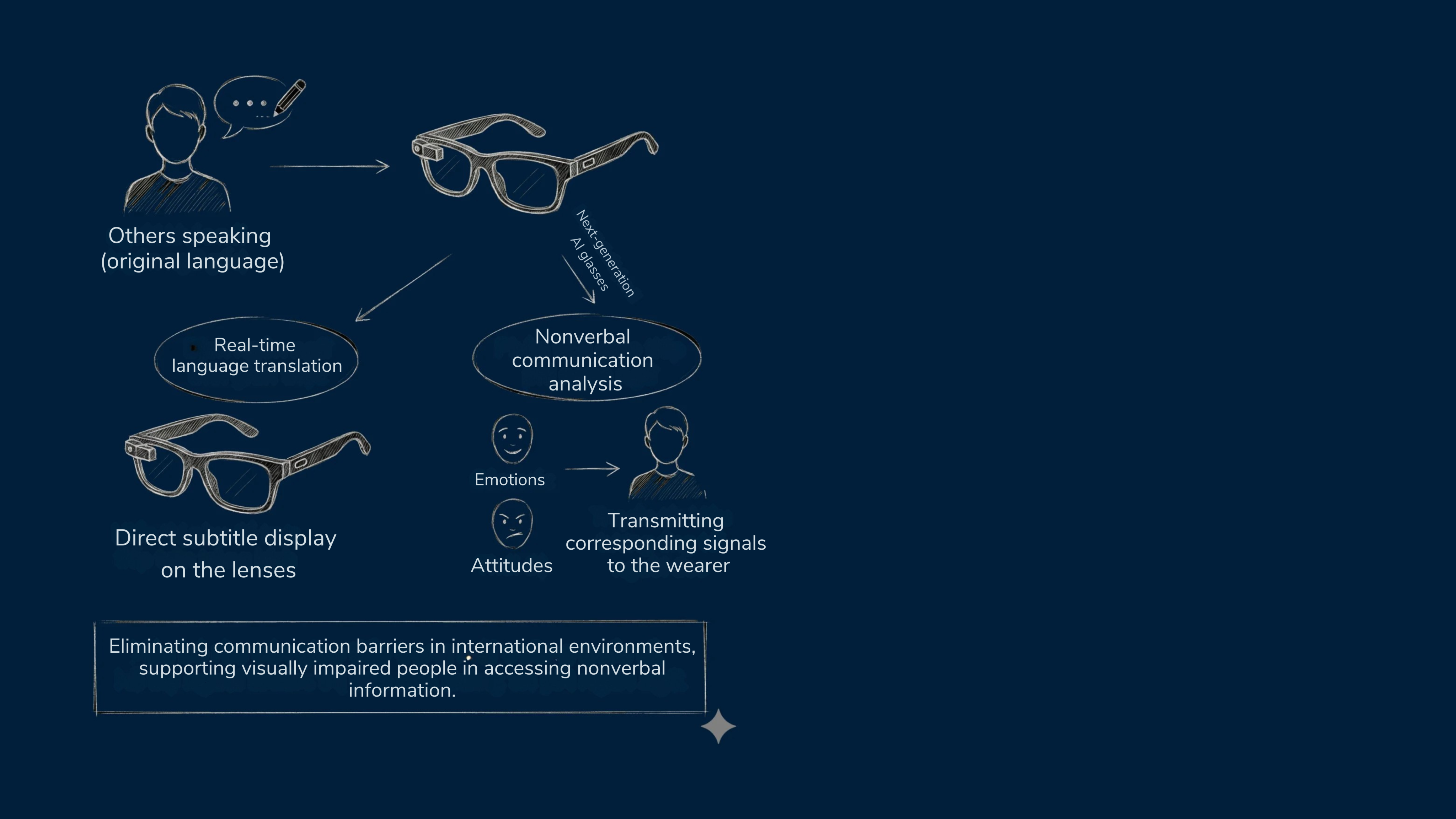 AI enables real-time language translation as soon as someone speaks, displaying subtitles directly on the lenses. This eliminates communication barriers in international environments. Next-generation AI systems can also analyse nonverbal communication (such as emotions and attitudes) and transmit corresponding signals to the wearer, something that visually impaired individuals often struggle with.