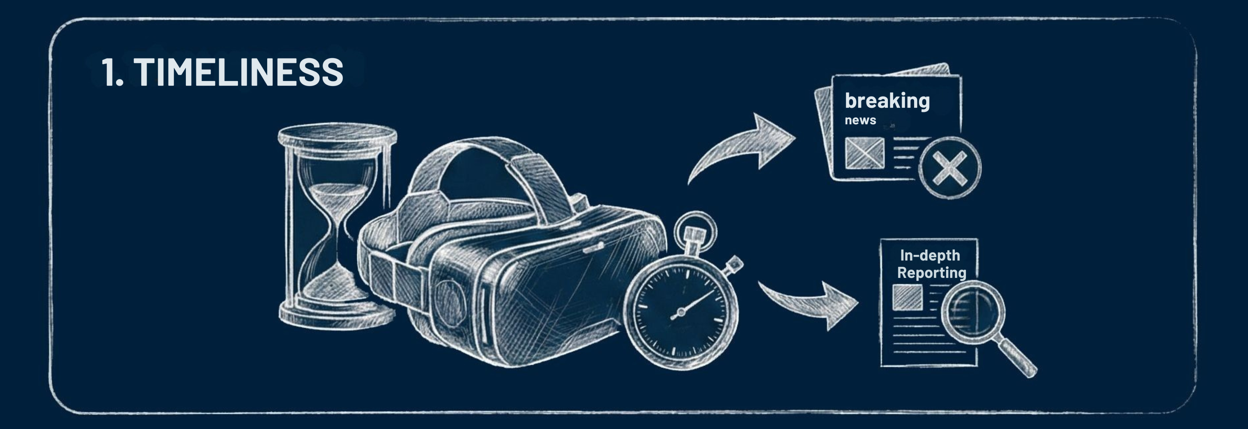 · Timeliness: Producing detailed AR/VR content requires considerable time, making immersive journalism less suited to breaking news and more appropriate for in-depth features and long-form reporting.