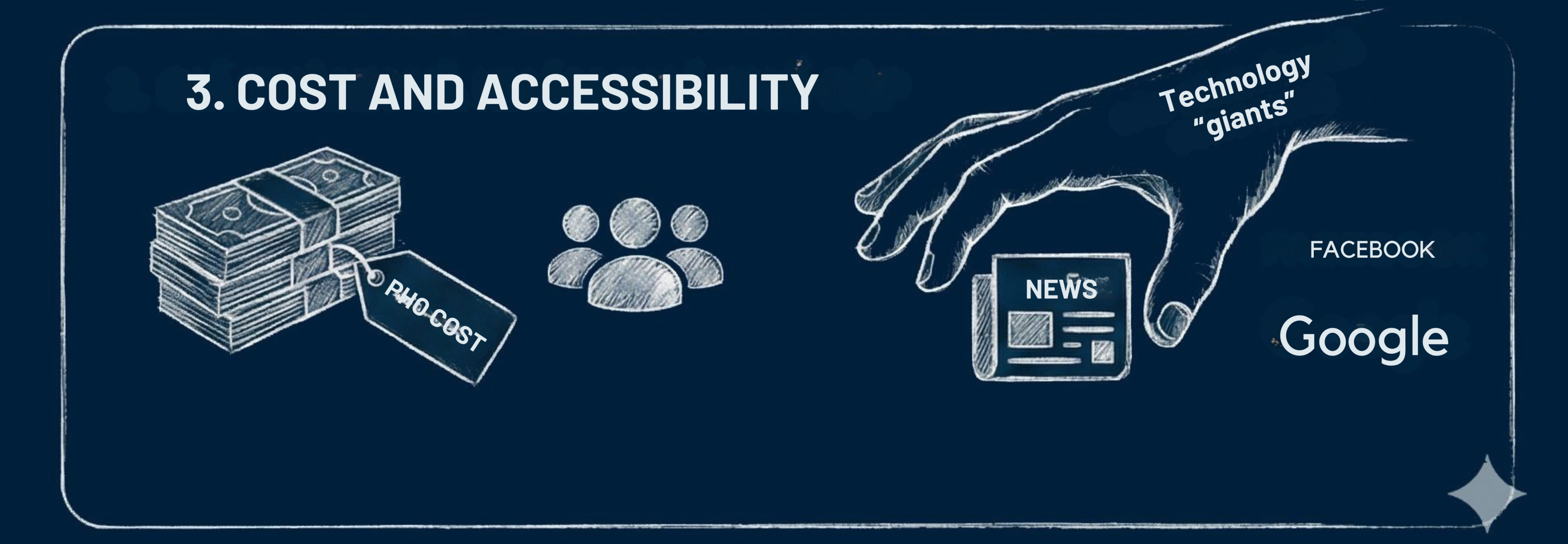 · Cost and accessibility: The expense of producing high-quality devices and AR/VR content remains a significant barrier to mass adoption. There is also the risk that journalism could become dependent on, or controlled by, technology “giants” that dominate information distribution on smart glasses, in much the same way as Facebook and Google have done on the web.