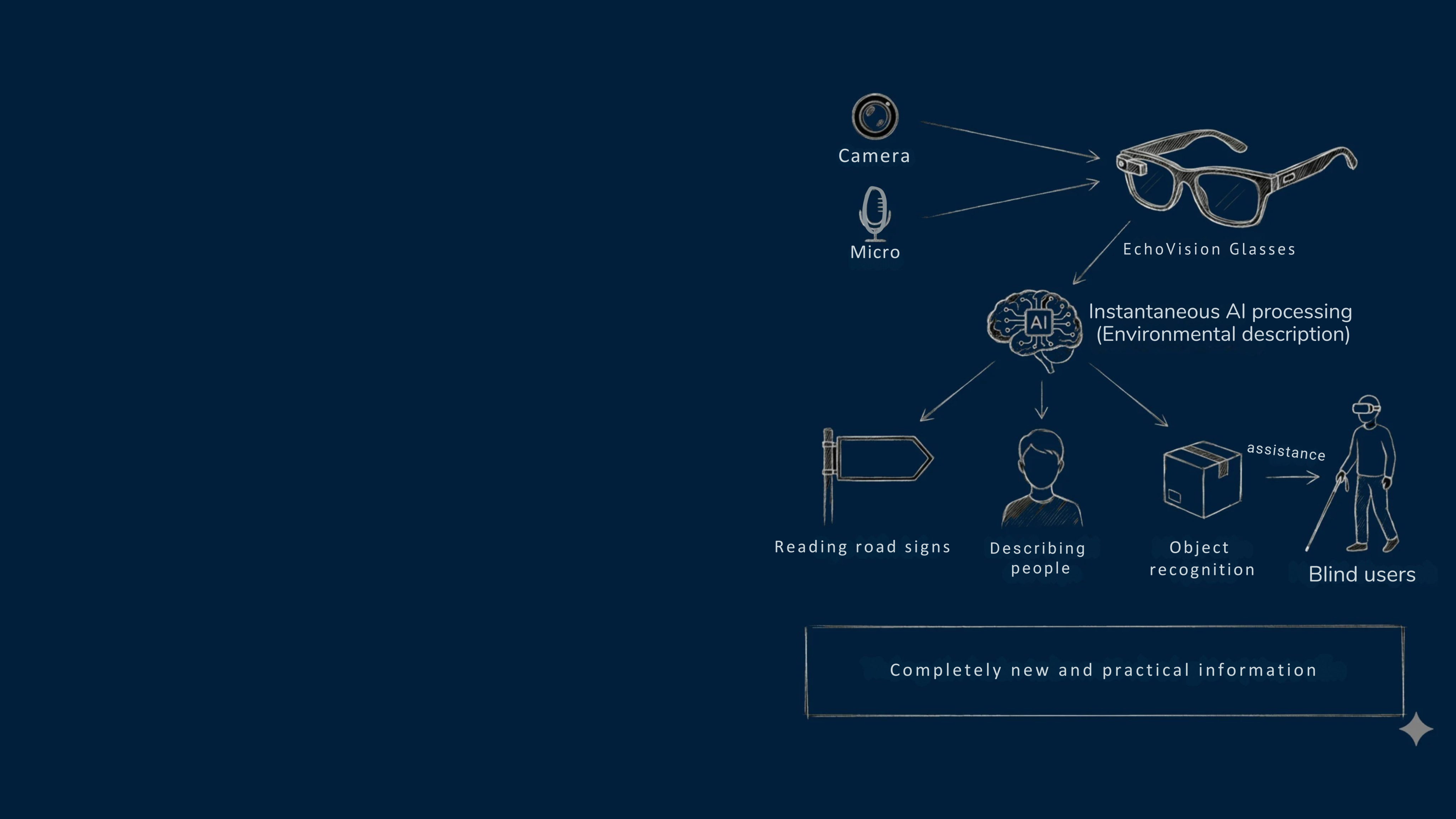 AI processes input data from the camera and microphone instantly to describe the surrounding environment. For example, the glasses can identify objects, read road signs, or describe people in an instant, helping blind users (as in the case of EchoVision glasses) obtain completely new and practical information instead of just repeating what they have already seen.