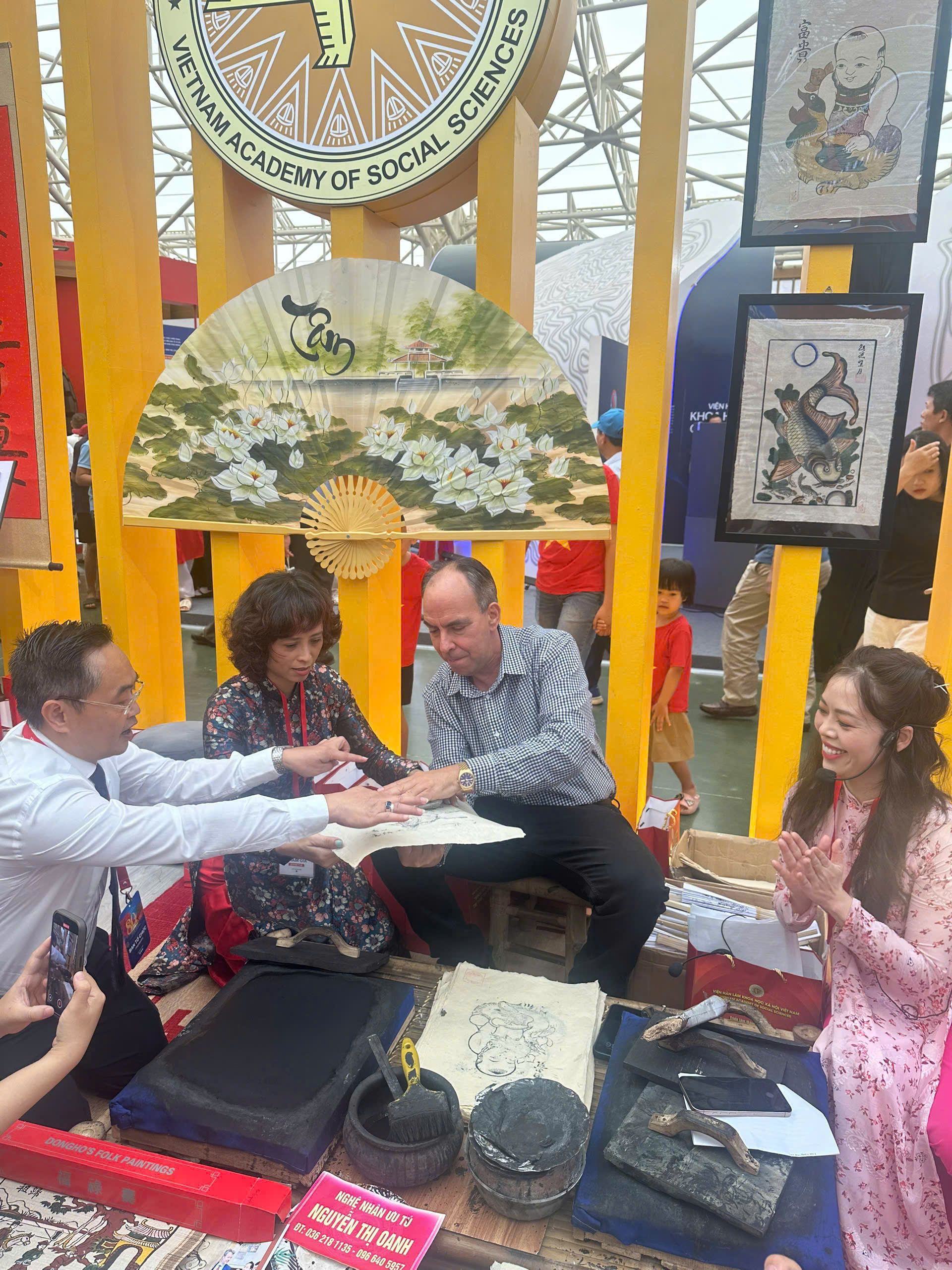 During his visit to the exhibition booth of the Viet Nam Academy of Social Sciences during the exhibition, Cuban Ambassador to Viet Nam Rogelio Polanco Fuentes stopped by the folk art experience area, which showcased Dong Ho folk paintings and traditional calligraphy works. He expressed his impressions of this folk art form as well as Viet Nam's comprehensive development.