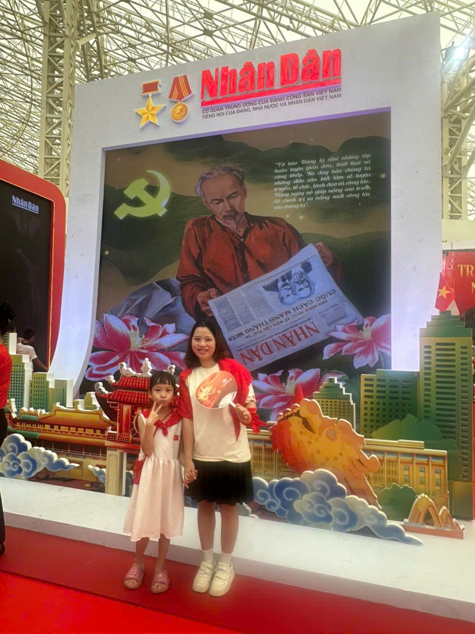 Visitors taking commemorative photos at the Nhan Dan Newspaper exhibition area