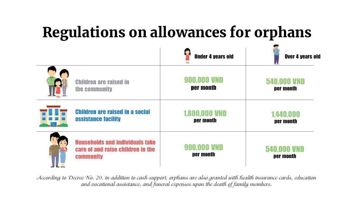 At the same time, each child, in the situation where both parents died; children who have lost their father or mother before, now lost the other parent to COVID-19; child under four years old, who have lost both parents or their parents abandoned them at a young age, and live with grandparents or foster caretakers who died from COVID-19, will receive support of one million VND per month. Each child from four years old and above will be supported with 700,000 VND per month.