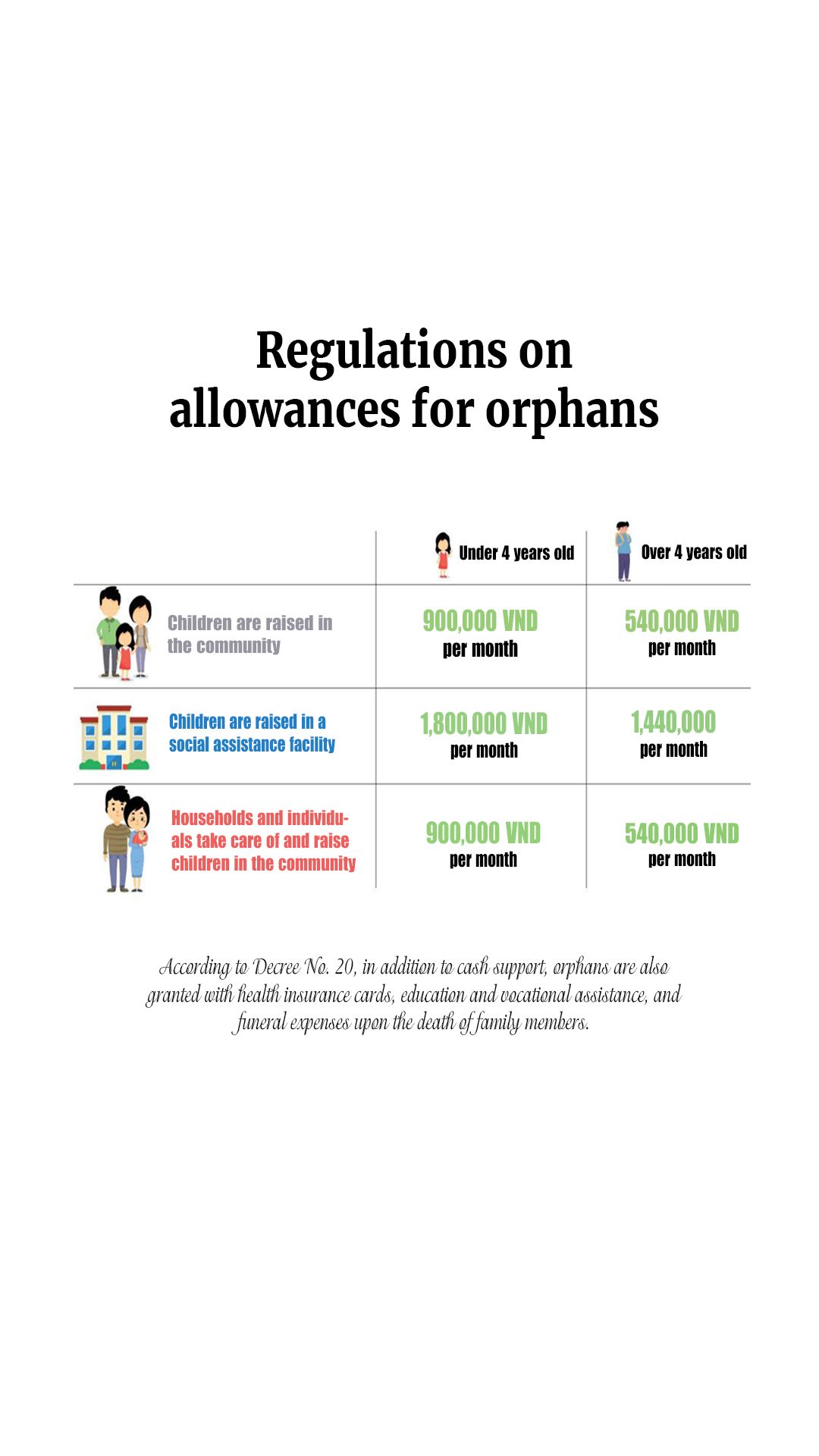 Orphans who are raised at social assistance establishments, are provided with items for daily living such as blankets, mosquito nets, mats, summer clothes, winter clothes, underwear, face towels, shoes, slippers, toothbrushes, common medicines, monthly personal hygiene necessities for females of childbearing age, books, notebooks, school supplies for students attending school and other expenses according to the law.