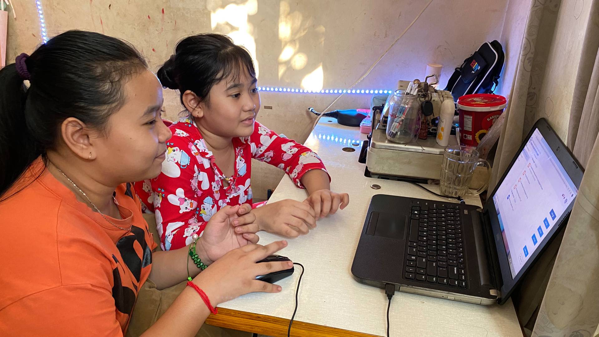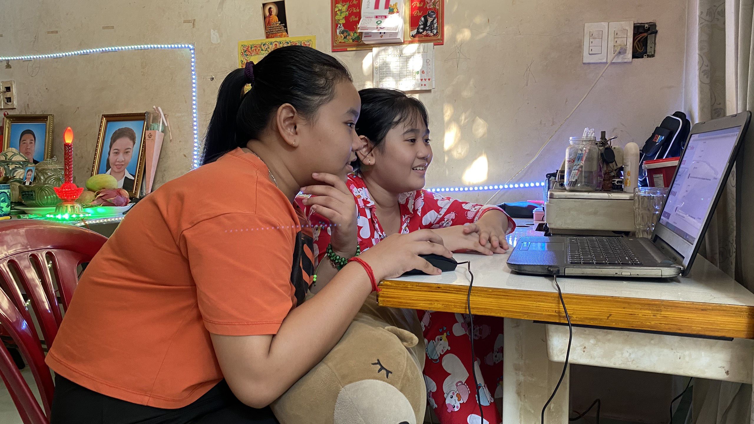 In a small rented room, just 20 square metres wide, in a neighbourhood in District 12, Ho Chi Minh City, the two sisters Yen Hoang and Yen Phung are busy with their lessons. Yen Hoang is a fifth grader while Yen Phung is a sixth grader.