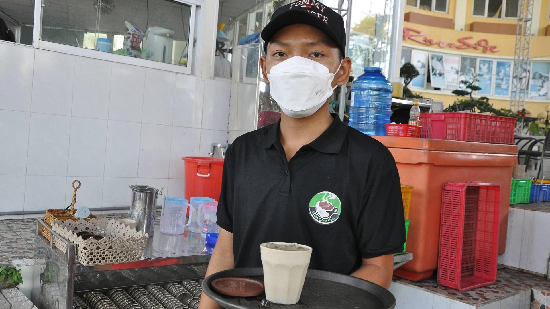 Huynh Hong Son serves guests with beverages. He wants to be provided with financial support so that he can go back to school.