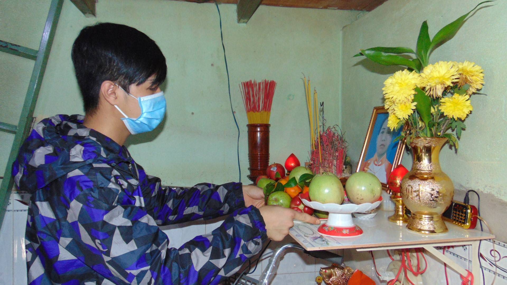 In a rental apartment in Thuan Giao ward, Thuan An city, Binh Duong province, Nguyen Quang Ha, burned incense for his mother, who died of COVID-19, and promised to take care of his 11-year-old younger brother Nguyen Ky Nam.
