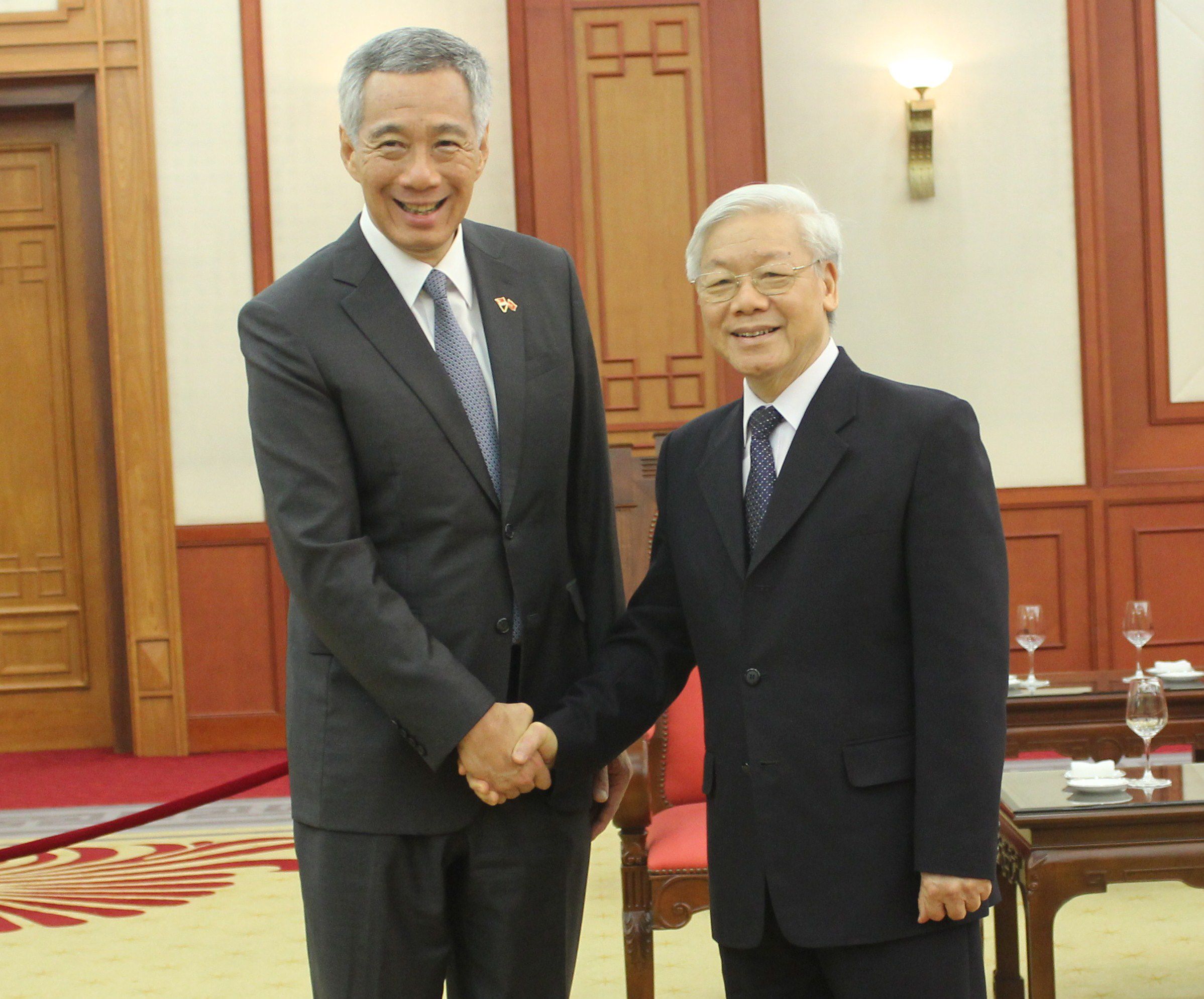 General Secretary Nguyen Phu Trong receives Singaporean Lee Hsien Loong during his official visit to Vietnam in March 2017.