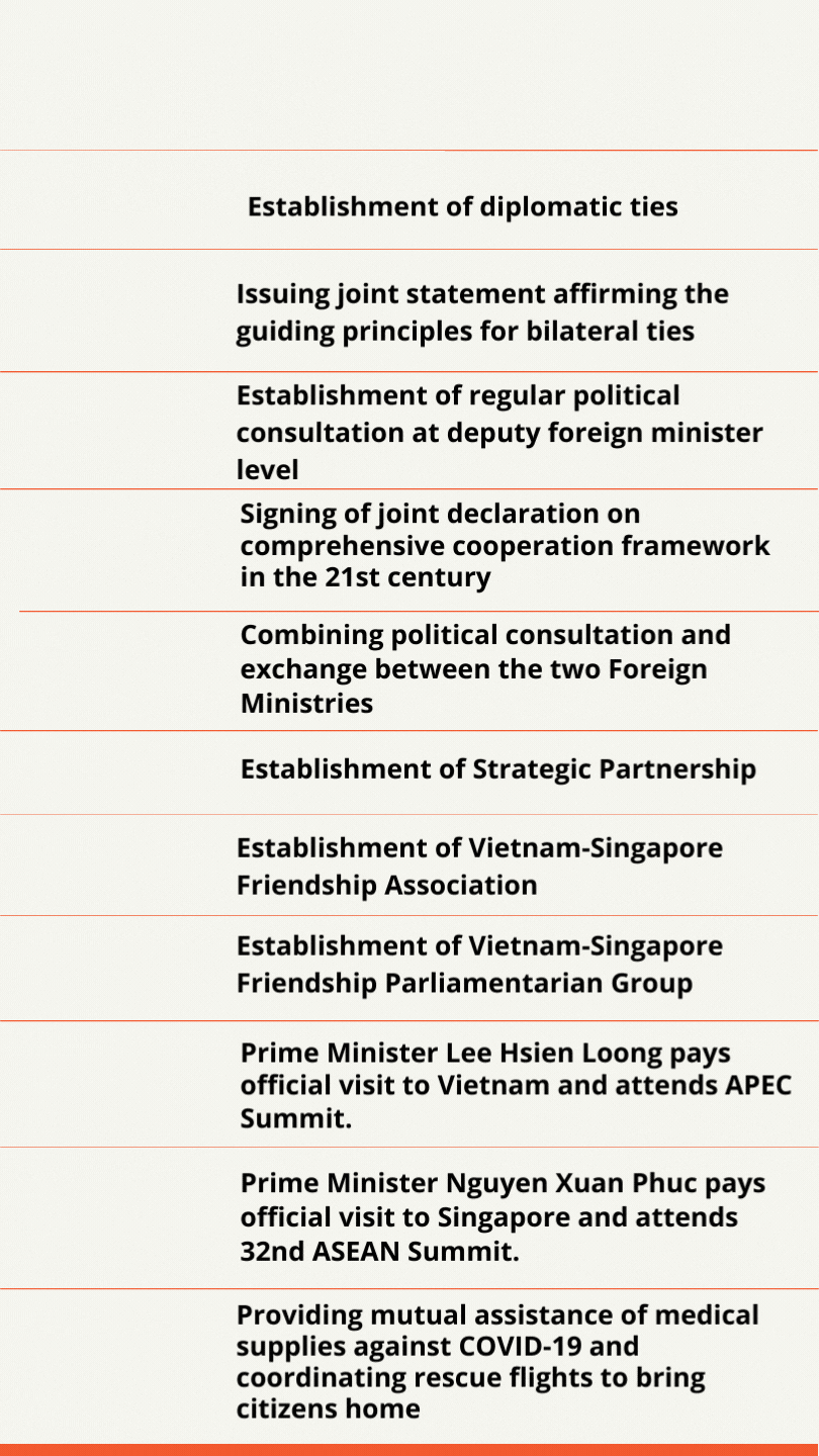 Vietnam and Singapore officially established diplomatic relations in 1973. After raising the relationship to a Strategic Partnership in 2013, the relationship between the two countries has grown in a deeper and more effective manner. In over half a century, the relationship between Vietnam and Singapore has become closer, with a high level of trust and cooperation between the two countries, obtaining many positive results.
