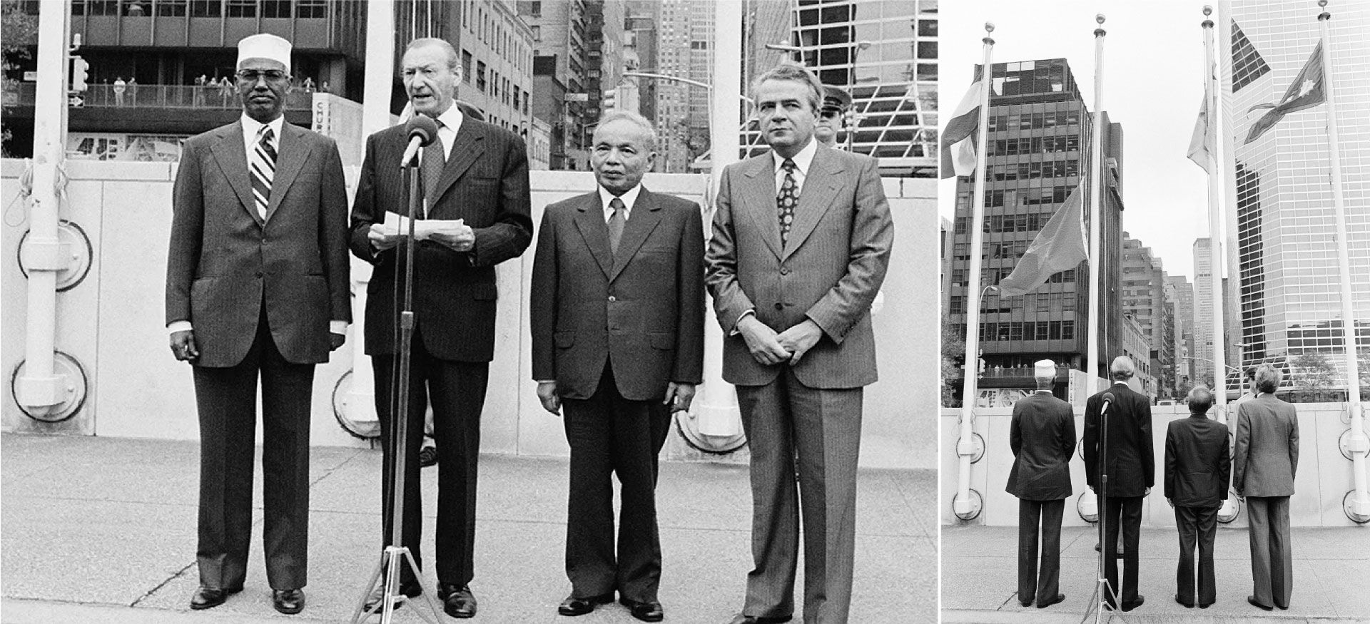 Vietnamese Deputy Prime Minister and Foreign Minister Nguyen Duy Trinh (second from right) attend the ceremony of hoisting the Vietnamese flag at the UN Headquarters in New York, US, September 21, 1977. (Photo: UN.ORG)