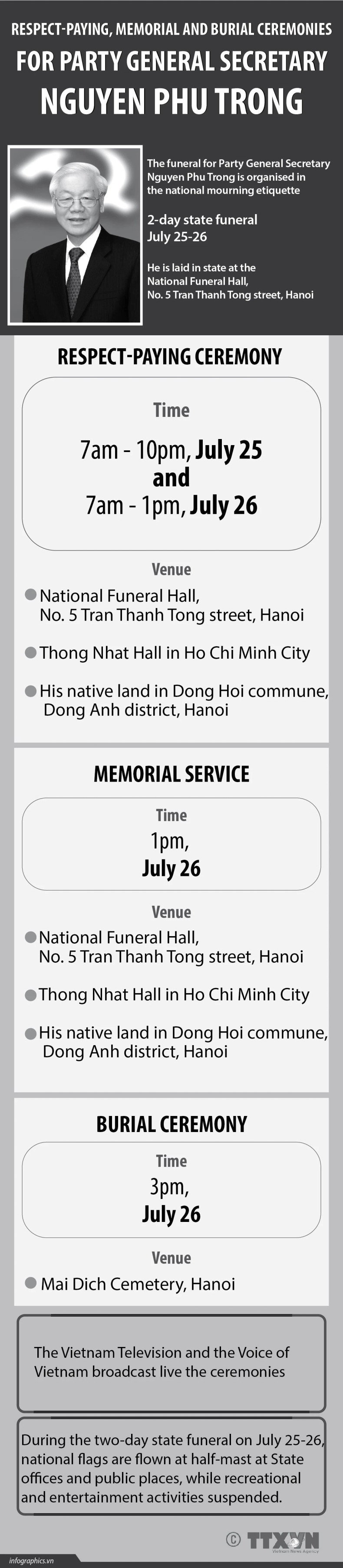 The funeral for General Secretary of the Communist Party of Vietnam Central Committee Nguyen Phu Trong is organised in the national mourning etiquette. The respect-paying and memorial ceremonies take place concurrently at the National Funeral Hall, No. 5 Tran Thanh Tong street, Hanoi, Thong Nhat Hall in Ho Chi Minh City and at the leader’s native land in Dong Hoi commune, Dong Anh district, Hanoi.