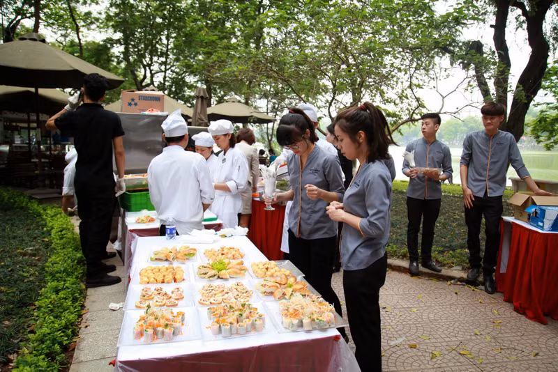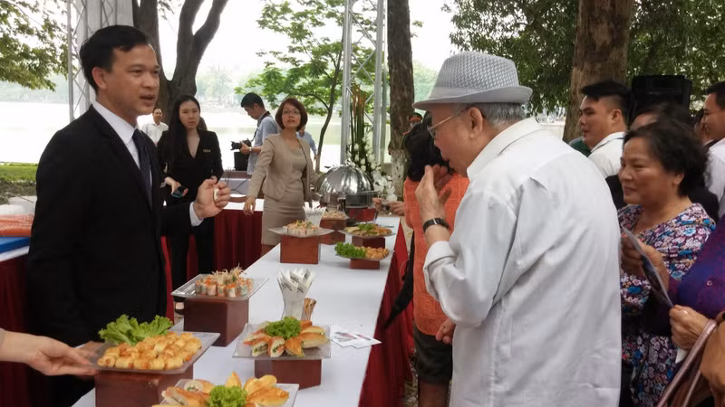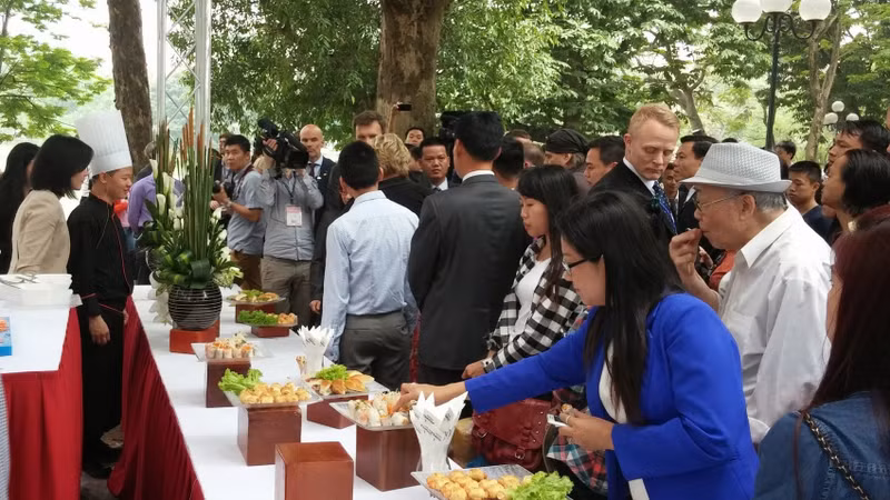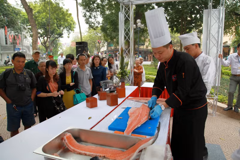 Passers-by were invited to taste Norwegian salmon prepared by Vietnamese chefs in various Norwegian and Vietnamese fusion dishes.