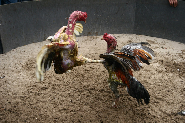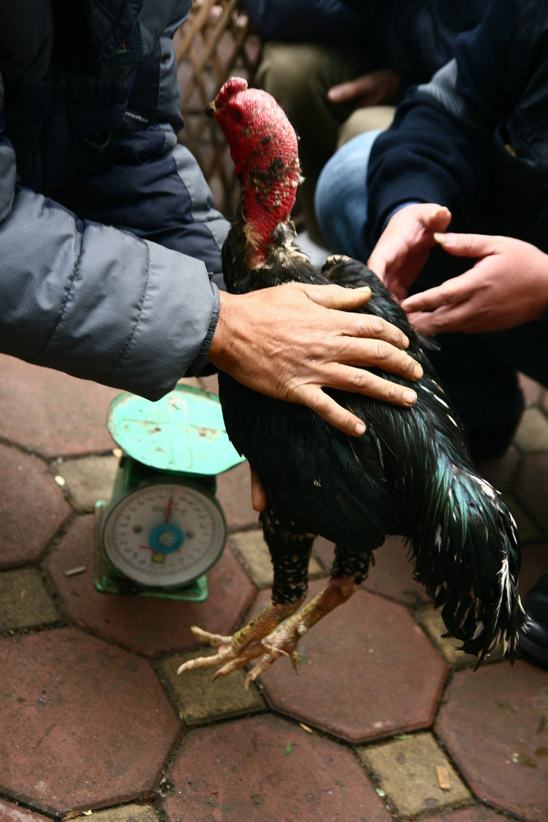 Before a cockfight begins, cocks’ owners compare the size, weight and combat achievements of their fighting cocks.