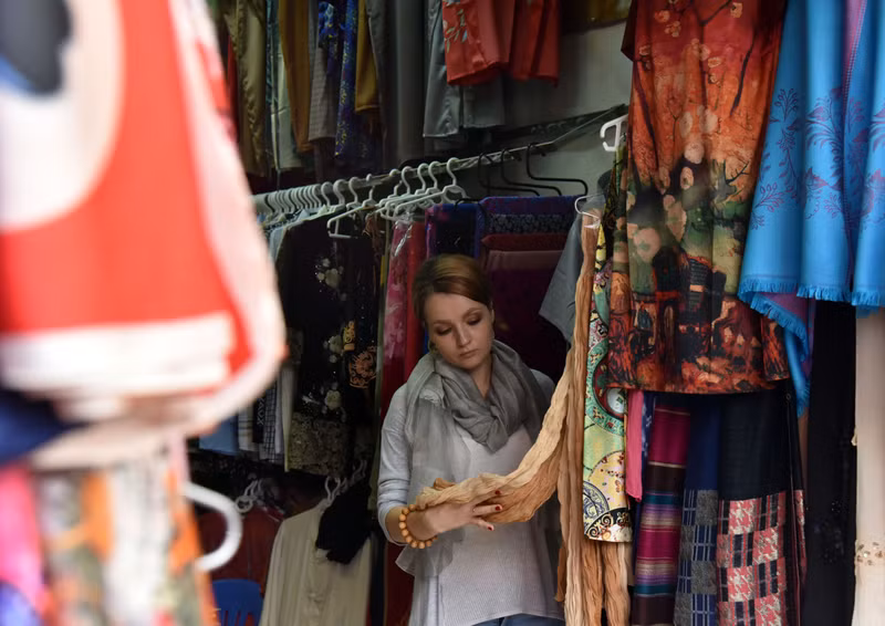 Hundreds of colourful umbrellas were hung up along the street, with booths showcasing silk cloths and products running along the sides.