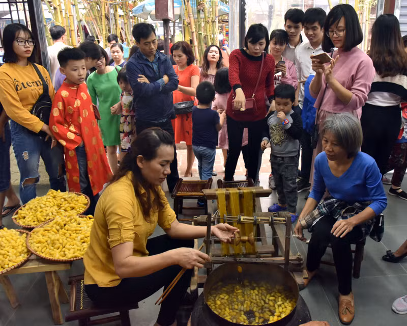Visitors listening to an artisan’s presentation on the silk weaving process in Van Phuc village.