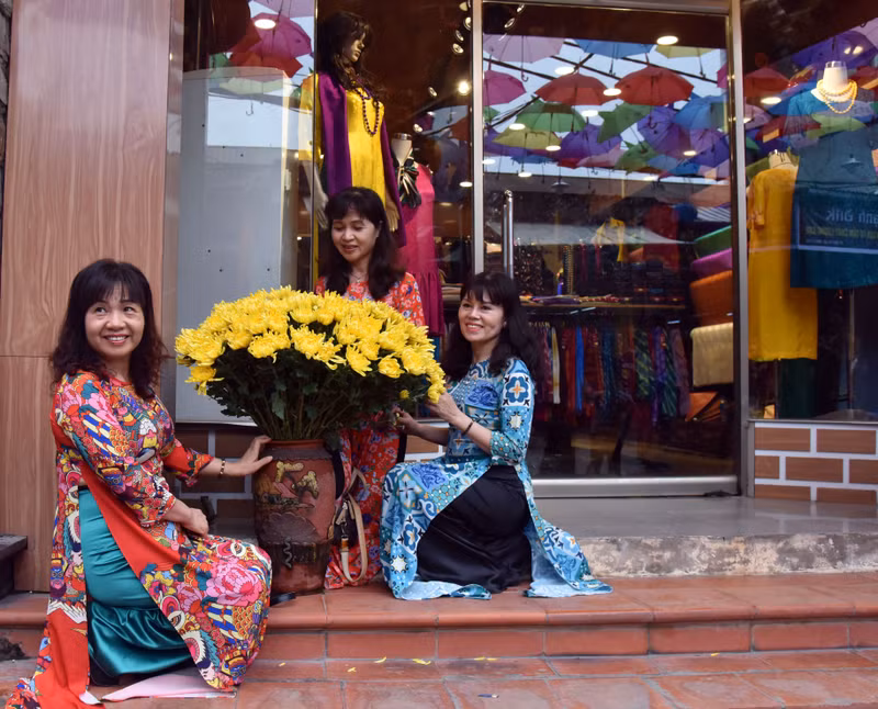 Women dressed in Ao Dai (traditional Vietnamese long dress) made from Van Phuc sik.