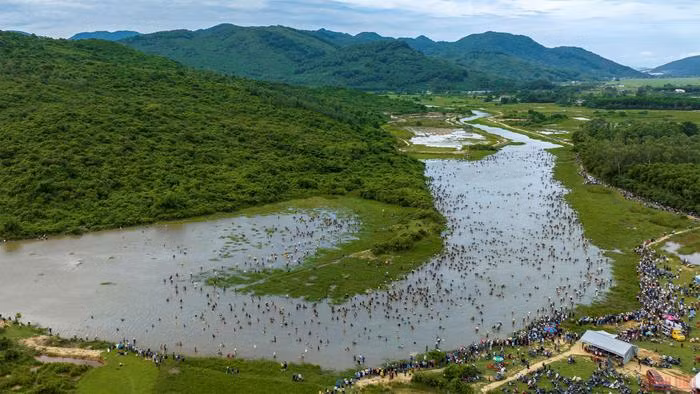 From dawn, people carry many kinds of fishing gear to join the festival. Following the ritual, the commune’s head will issue an order and hundreds of people rush into the lagoon to catch fish.