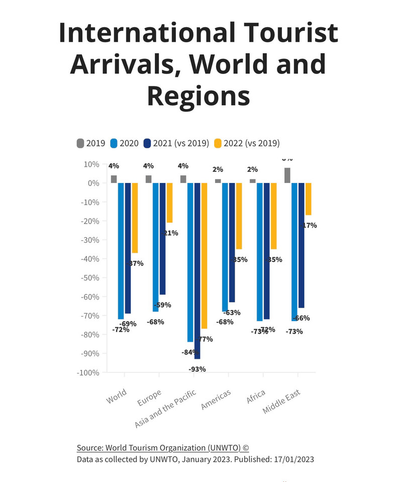 Based on the World Tourism Organisation (UNWTO)'s forward-looking scenarios for 2023, international tourist arrivals could reach 80% to 95% of pre-pandemic levels this year, depending on the extent of the economic slowdown, the ongoing recovery of travel in Asia and the Pacific, and the evolution of the Russia-Ukraine conflict, among other factors.
