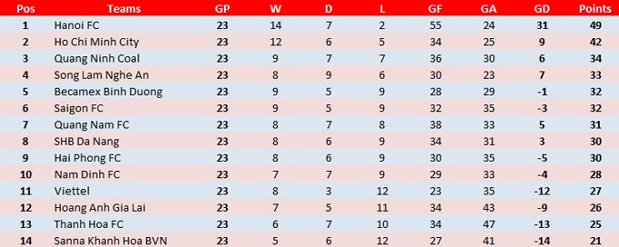 In other Sunday fixtures, Song Lam Nghe An demolished hosts Becamex Binh Duong 5-1, while Quang Ninh Coal thrashed Thanh Hoa 3-1 away to retain their third place position in the table.