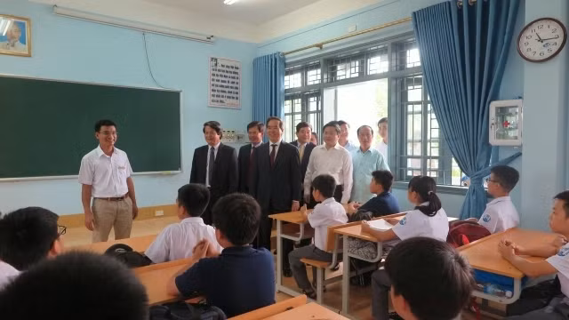 Politburo member Nguyen Van Binh (in suit, second from right) joins the leaders of Phu Tho province to visit a class at Hung Vuong High School. (Photo: NDO/Ngoc Long)
