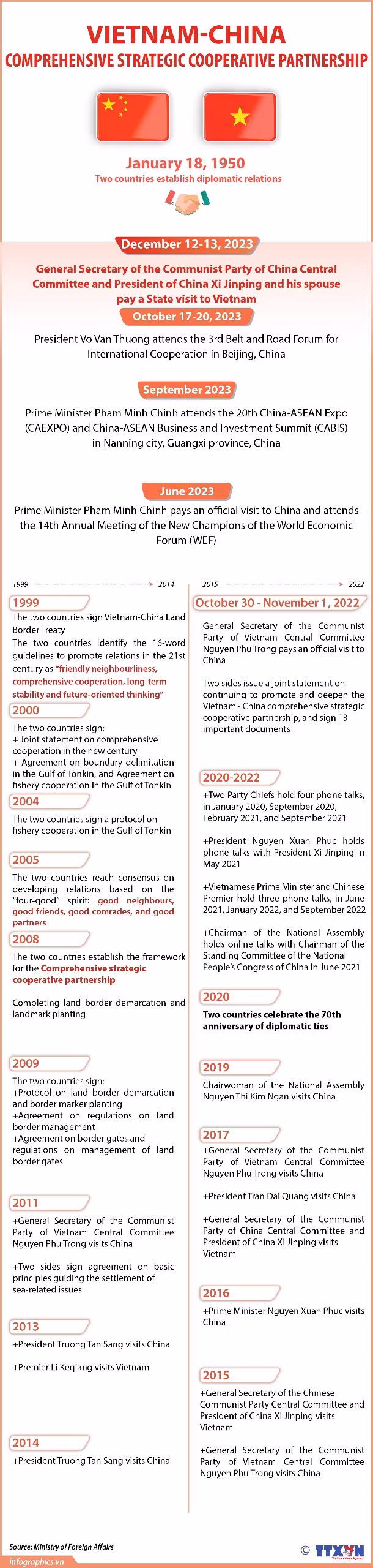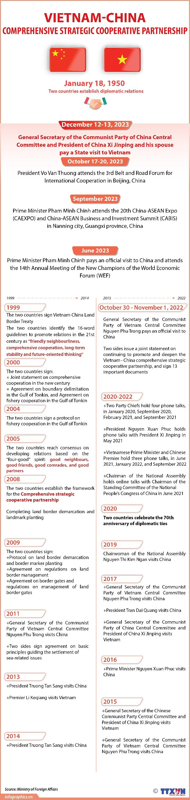 General Secretary of the Communist Party of China Central Committee and President of China Xi Jinping and his spouse pay a State visit to Vietnam. The visit on December 12-13 is made at the invitation of General Secretary of the Communist Party of Vietnam Central Committee Nguyen Phu Trong and his spouse, and President Vo Van Thuong and his spouse.