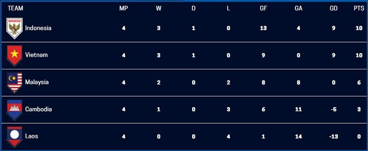 With a 4-0 rout of Cambodia, the Golden Star Warriors advanced to the semifinals as the Group B runners-up. They had the same points (10) and goal difference but scored fewer goals than the Indonesians.