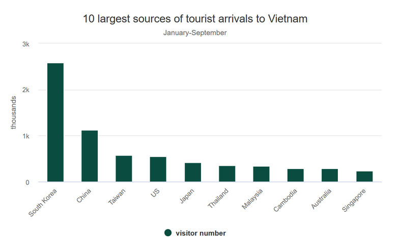 The Republic of Korea continues to be the largest source of tourist arrivals, with over 2.5 million in the first nine months, followed by China.