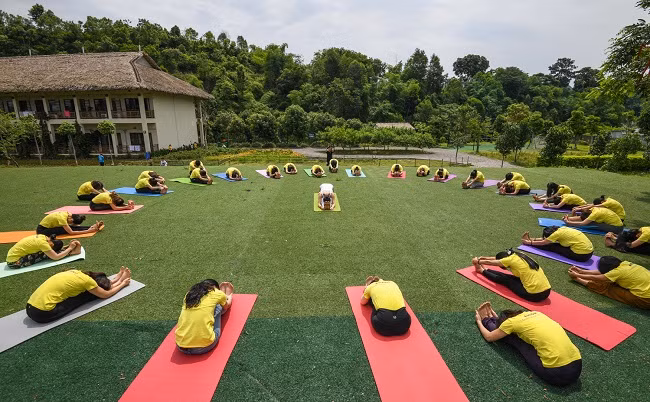 Visitors join an outdoor yoga class as part of their tour to An Lac Eco Farm & Hot Springs in Hoa Binh province. (Photo: VnExpress)