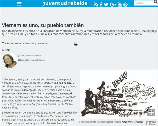 The daily Juventud Rebelde (Rebel Youth) - a newspaper of the Young Communist League - described Vietnam’s victory on April 30, 1975 as a “brilliant epic” and highlighted “President Ho Chi Minh affirmed that ‘Vietnam is one, the Vietnamese people are one’ – and that day, that aspiration came true.”