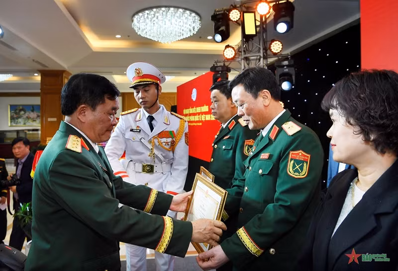 | Senior Lieutenant General Le Quang Minh presents the Certificates of Merit from the Chief of the General Department of Politics of the Vietnam People's Army to the collectives that achieved outstanding results at the expo. |