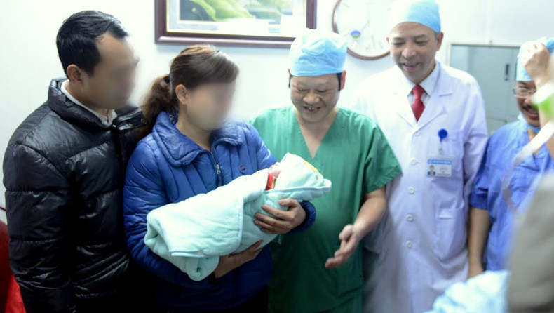 The couple (left) receive their baby from Deputy Minister of Health Nguyen Viet Tien (in green blouse), who directly performed the c-section for the first surrogacy in Vietnam, Hanoi, January 22, 2016. (Credit: zing.vn)