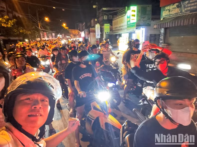 | People flock to Truong Chinh Street to celebrate Vietnam national football team's victory. (Photo: THE DAI) |