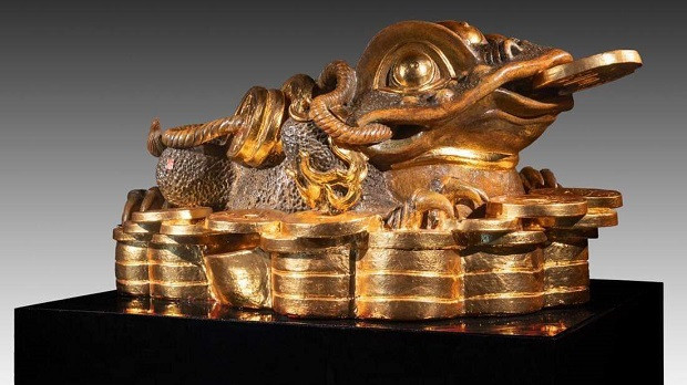 One of them is ‘Thiem thu thien phong an’, which is a sculpture of a toad - a mythical creature symbolising prosperity in Vietnamese belief. Sitting atop a pile of gold coins, the toad is carved with the yin yang symbol on its head, the Great Bear constellation on its back, and a coin in its mouth.