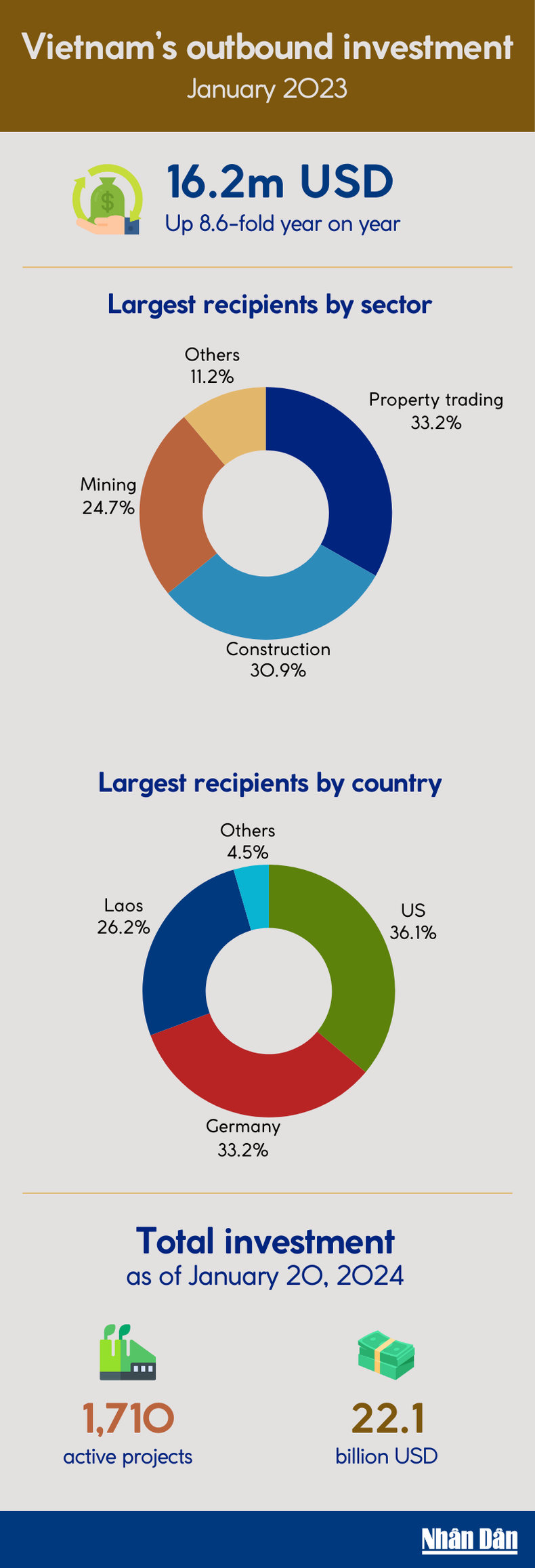 Vietnam’s outbound investment in January is estimated at 16.2 million USD, up nearly eight times compared to the same period last year, according to the Ministry of Planning and Investment.
