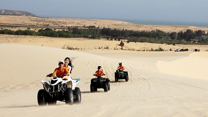 Visitors riding off-road vehicles through the sand dunes in Bau Trang, Binh Thuan Province. (Photo: Dinh Chau)