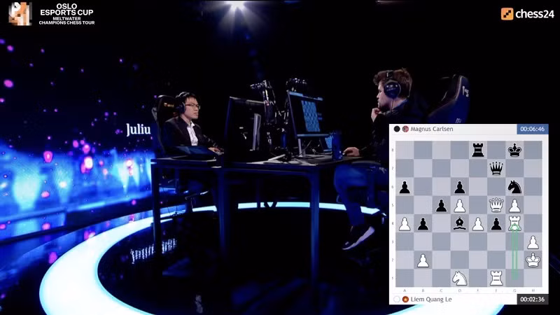 Le Quang Liem (left) plays against the reigning world No. 1 Magnus Carlsen at the Oslo Esports Cup in Norway early April 24, 2022. (Photo: CHESS24)