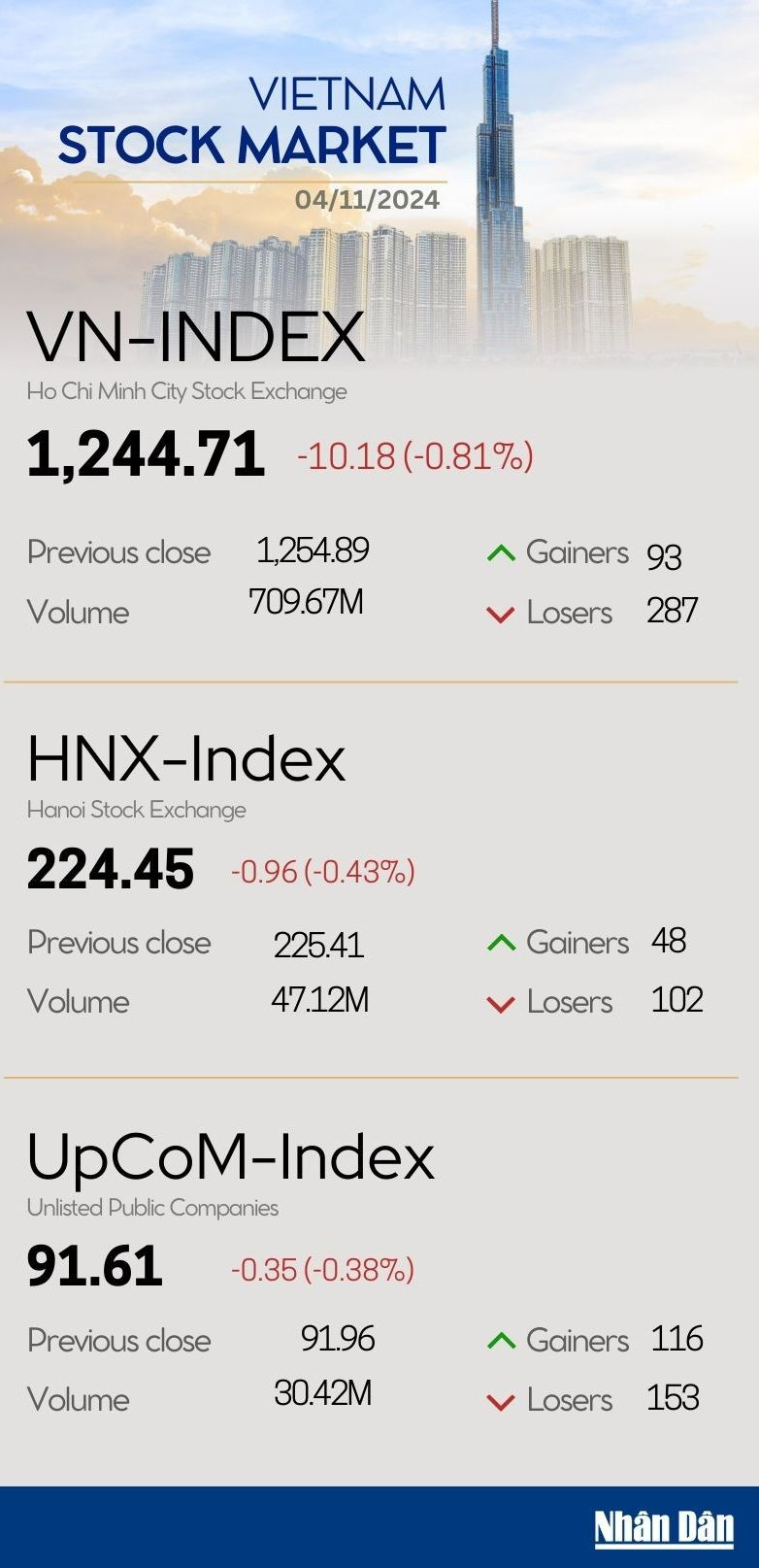 Vietnam's benchmark VN-Index fell 0.81% to 1,244.71 points on November 4. The index closed 10.18 points lower after dropping 9.59 points in the previous session.