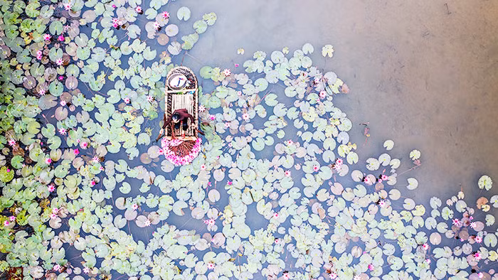 The scene of harvesting water lilies viewed from above.