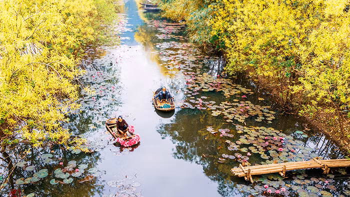 However, photographers and people who love wild and peaceful beauty, often come here in late November and early December, to capture the breath-taking moment of water lilies in full bloom. The magnificent purple water lilies along the Yen stream on the way to Huong Pagoda create a wonderful natural picture.