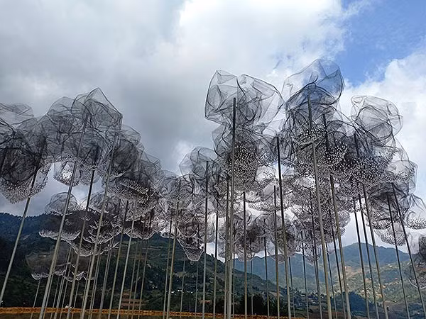 The exhibition is hosted by the Vietnam Association of Architects in collaboration with a Vietnamese American artist and Mu Cang Chai district. Approximately 59,000 colourful crystal beads on clouds made of wire mesh mounted on iron pillars have been erected on the terraced fields which are considered the best in the world in La Pan Tan commune, Mu Cang Chai district.